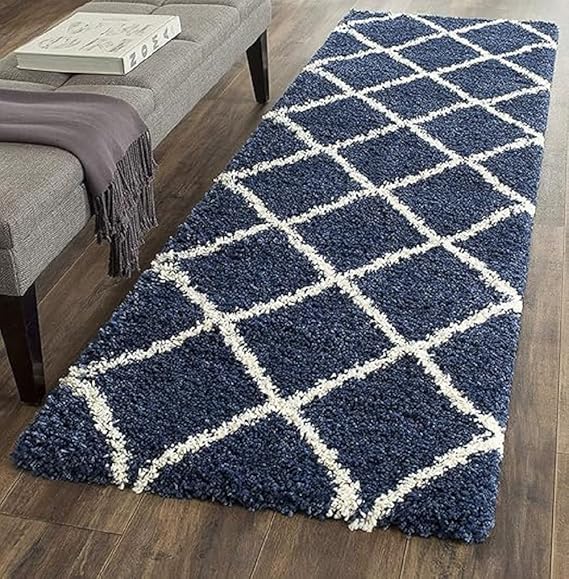 • Blue and Ivory Diamond Shaggy Runner Rug Modern Style