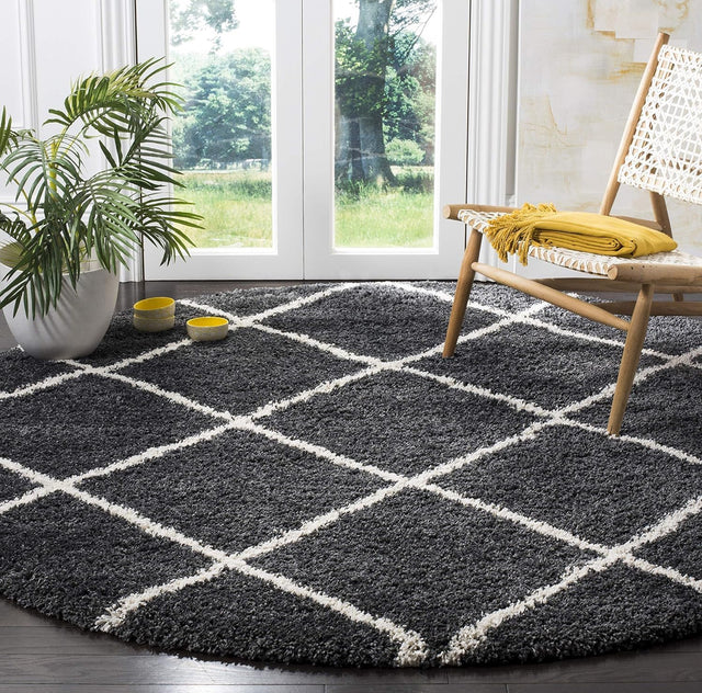 • Charcoal Grey Geometric Round Shaggy Carpet